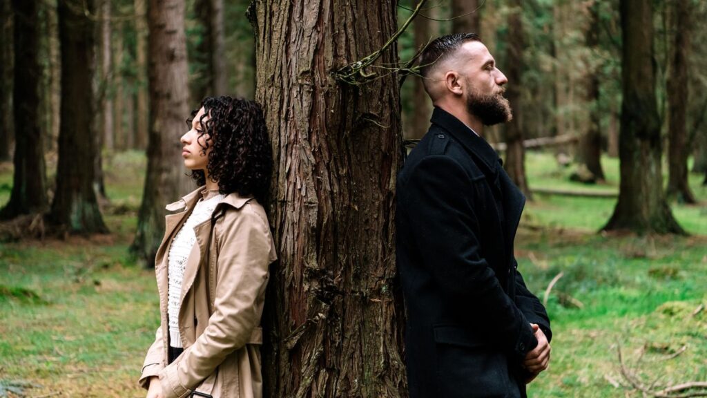 Trennungsgründe: Paar steht Rücken an Rücken an einen Baum gelehnt