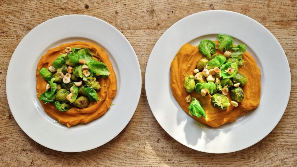 Aus dem Kürbis und den Gelberbsen mache ich ein Püree, das an Hummus erinnert. Den Rosenkohl gibts gebraten mit Haselnüssen. Wir waren erstaunt, wie gut das alles zusammen harmoniert. Die Gelberbsen ersetzen (mir) die Speckwürfel, zudem halten sie die Süsse des Kürbis in Grenzen.