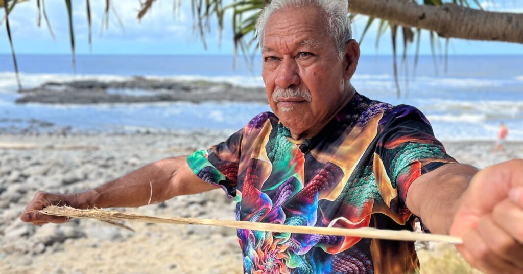 Mano Totau am Strand bei Brisbane, Australien. Wie man aus Baumrinde Seile macht, hat er von seinen Großeltern gelernt. Solches Wissen rettete ihm und seinen Freunden auf der einsamen Insel das Leben.