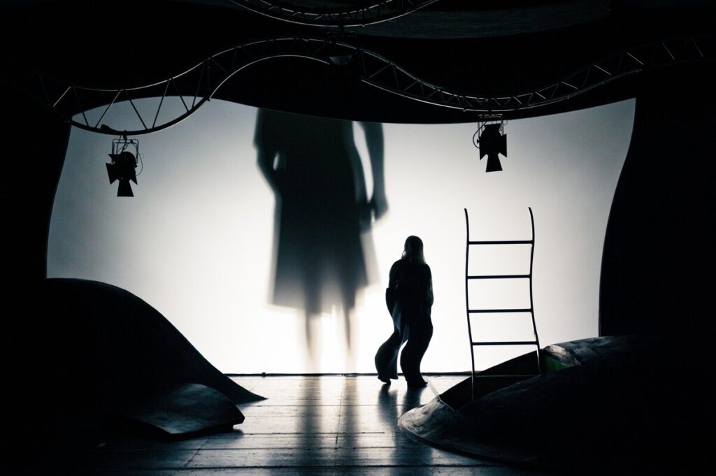 Das letzte Drittel des Abends zeigt die alten Eltern bei einer Wiederbegegnung im Hospiz, das auch der Himmel sein könnte oder der Raum hinter der Stirn ihrer Tochter. Hinter einer Leinwand agieren die Eltern in absurden Größenverhältnissen, mal kauert der Vater als Schatten wie ein Männchen vor der Mutter, mal überwölbt er sie riesenhaft und überzeichnet.