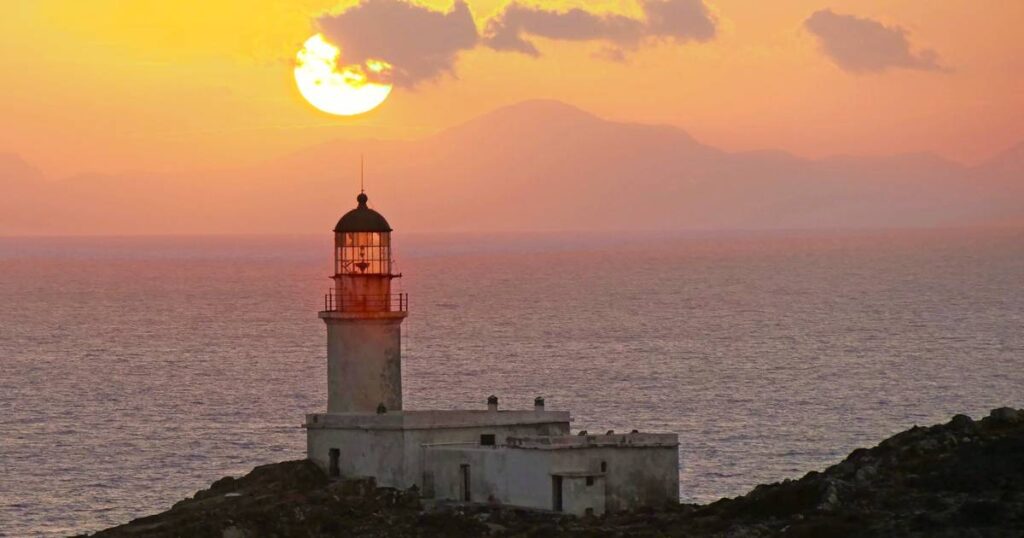 Es gibt viele Orte auf der Welt, die für sich beanspruchen, das „Ende der Welt“ zu sein. Das Kap des Heiligen Vincent an der portugiesischen Algarve gehört dazu, ebenso Land‘s End, der westlichste Punkt des englischen Festlands. Dahinter erstreckt sich nur noch der Atlantischer Ozean. Die windumtoste Landspitze auf der Halbinsel Prasonisi, im Süden von Rhodos gelegen, gehört nicht zu diesen legendären Destina­tionen. Und doch stellt sich gerade hier ein intensives Gefühl von Abgeschiedenheit ein. Die Landschaft wirkt ursprünglich, wild und überraschend einsam – ganz anders als an vielen „offiziellen“ Ende-der-Welt-Orten, die längst zu beliebten Touristenzielen geworden sind. Nur fünf Menschen finden sich an diesem lauen Abend im Frühsommer am Fuße des Leuchtturms ein, um den Sonnenuntergang zu genießen. Wie in Zeitlupe sinkt der glühende Feuerball dem Horizont entgegen und taucht den Himmel in leuchtendes Orange, tiefes Rot und sanfte Lilatöne.