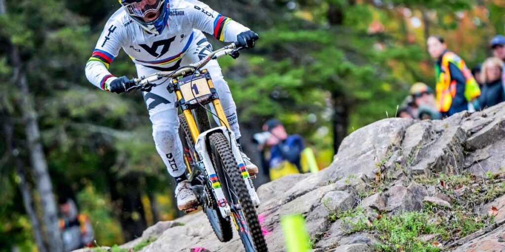Valentina Höll ist die alles überragende Downhillerin. Das Foto zeigt sie beim Weltcup in Mont-Sainte-Anne im Oktober 2024. Dort findet kommendes Wochenende das heurige Weltcupfinale statt.