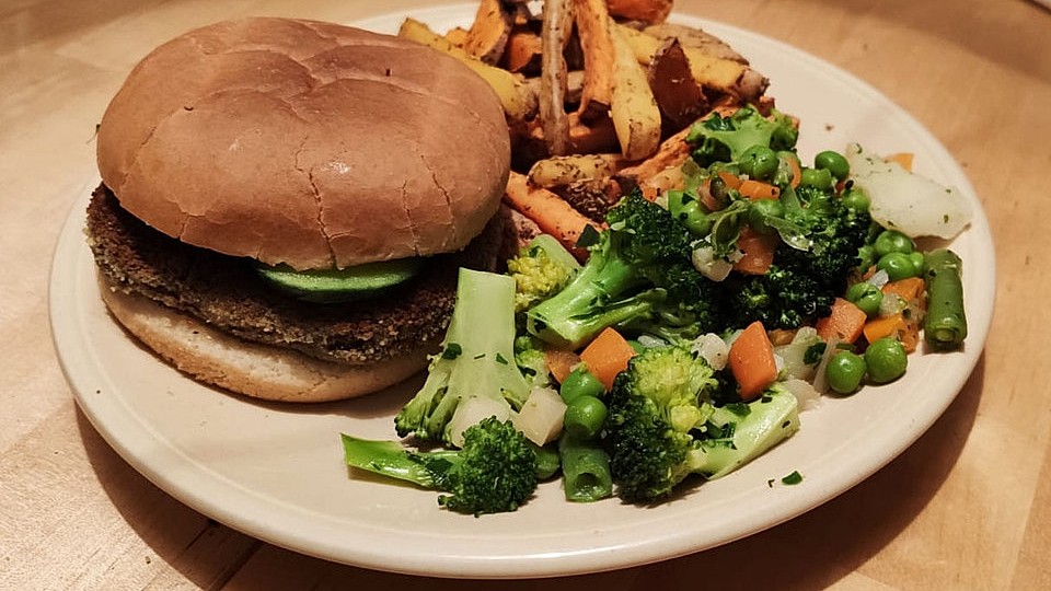 Den Teig nach Belieben formen, bei Bedarf eventuell noch Mehl dazugeben. Die Patties zunächst in Mehl, dann in Pflanzenmilch und schließlich in Paniermehl wenden und so paniert in reichlich Öl goldbraun braten.
