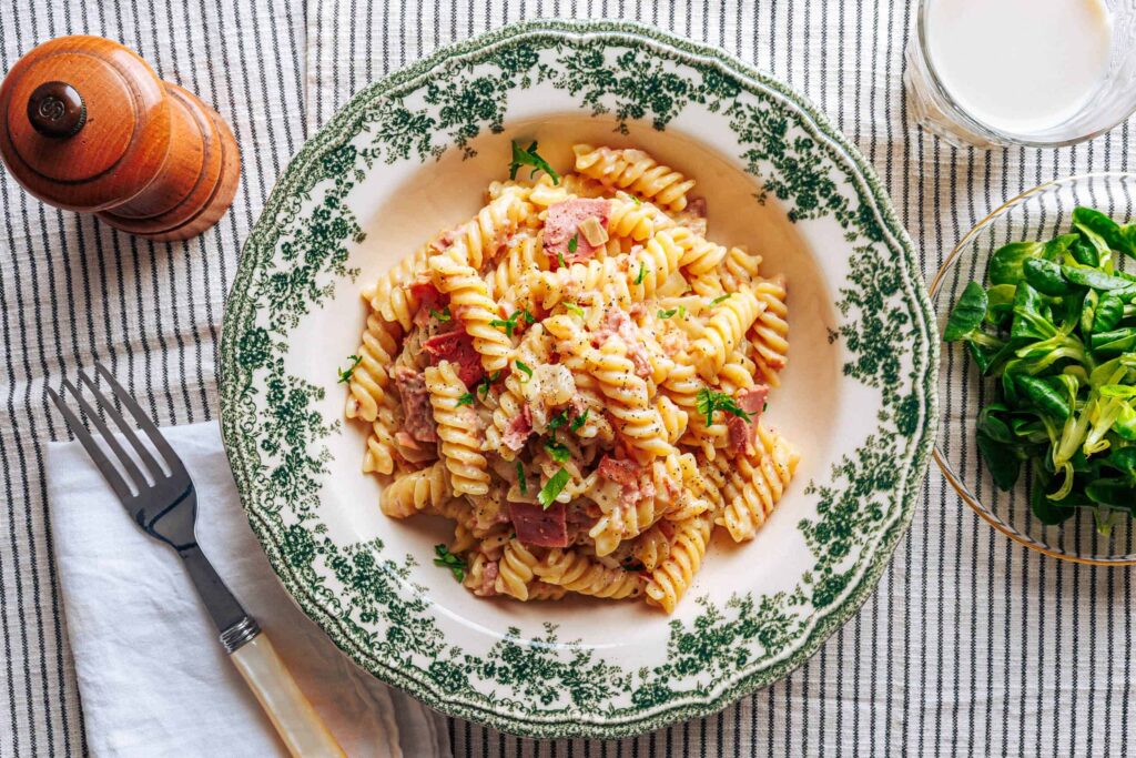 Stellt sich eigentlich nur noch die Nudelfrage. Für mich müssen es Fusilli oder kurze, breite Bandnudeln sein, die einen Tick über al dente gekocht werden. Alles andere fühlt sich irgendwie falsch an – ich bin einfach nudelkleinlich. Erbsen dagegen finde ich eine tolle optionale Ergänzung, auch wenn bei uns ein paar Fussel Petersilie das einzig Grüne an Schinkennudeln waren. Abgesehen vom obligatorischen „grünen Salat“, der wahlweise aus Kopf-, Eis- oder Feldsalat bestehen darf.