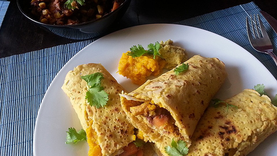 Am Tisch die Tortillas mit Kürbis-Guacamole bestreichen, auf jeder Tortilla 1 oder 2 EL Bohnenmasse in der Mitte längs verteilen, nach Geschmack Kichererbsenmus dazugeben, einrollen und genießen.