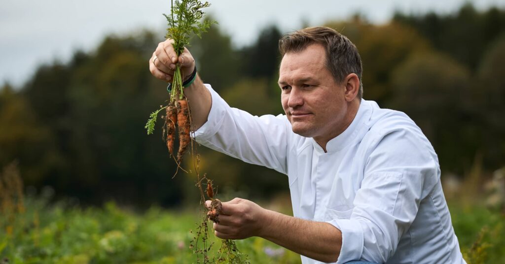 In der Restaurantküche von Simon Tress sieht es aus, als wäre gerade ein lila Farbbeutel explodiert, überall schmierige Flecken, Kleckse neben Sprenkeln – auf der Arbeitsfläche, an der Wand, auf dem Boden, sogar an der Decke. Die lila Farbe stellt sich als Johannisbeerpüree heraus. Trester aus Kernen, Schalen und Fruchtfleischresten, der in einer Küchenmaschine zu Creme gemahlen werden sollte, doch während der Fahrt ist der Deckel abgeflogen. „Tja, die war zu voll, ich bin heute echt ungeschickt“, seufzt der Koch und greift nach einem Lappen.