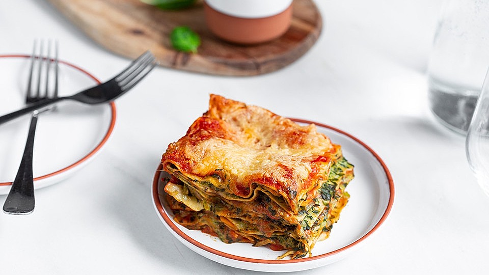 Im heißen Backofen bei 180 °C Umluft ca. 30 Minuten backen. Nach dem Backen noch fünf bis zehn Minuten im ausgeschalteten Backofen stehen lassen, dann bleibt die Lasagne perfekt in Form und zerläuft nicht.