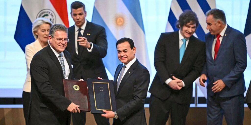 Wien/Brüssel/Asuncion – Nach über 25 Jahren Verhandlungen haben Vertreter der Europäischen Union und von vier südamerikanischen Ländern des Staatenbunds Mercosur das Freihandelsabkommen zwischen beiden Wirtschaftsblöcken unterzeichnet. An der Zeremonie in der Zentralbank in Paraguays Hauptstadt Asunción nahmen EU-Kommissionspräsidentin Ursula von der Leyen, Ratspräsident António Costa, Argentiniens Präsident Javier Milei, Paraguays Staatschef Santiago Peña und Uruguays Präsident Yamandú Orsi teil.