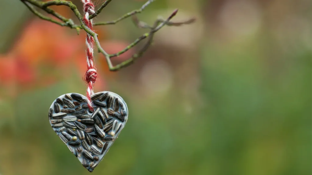 200 Gramm Kokosfett erwärmen, bis es flüssig ist. Ein Backblech mit Alufolie auslegen und Ausstechförmchen in Herzform darauf verteilen. Hirsesamen oder Sonnenblumenkerne etwa fünf Millimeter hoch in die Förmchen füllen. Hierbei gleich Stoffband zum Aufhängen einarbeiten. Fett eingießen und abkühlen lassen. Die erkalteten Herzen aus der Form lösen und aufhängen. Wer beim Einfüllen das Band vergessen hat, kann nachträglich einen dünnen Draht durch die Formen stechen.