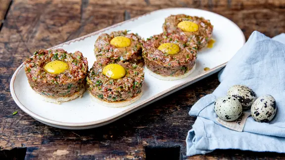 Fünf Portionen Rindertatar, jeweils mit einem Wachteigelb in der Mitte.