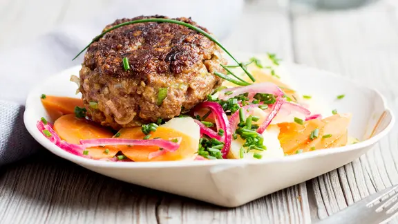 Frikadelle mit Pastinaken-Kartoffel-Salat angerichtet auf einem Teller.