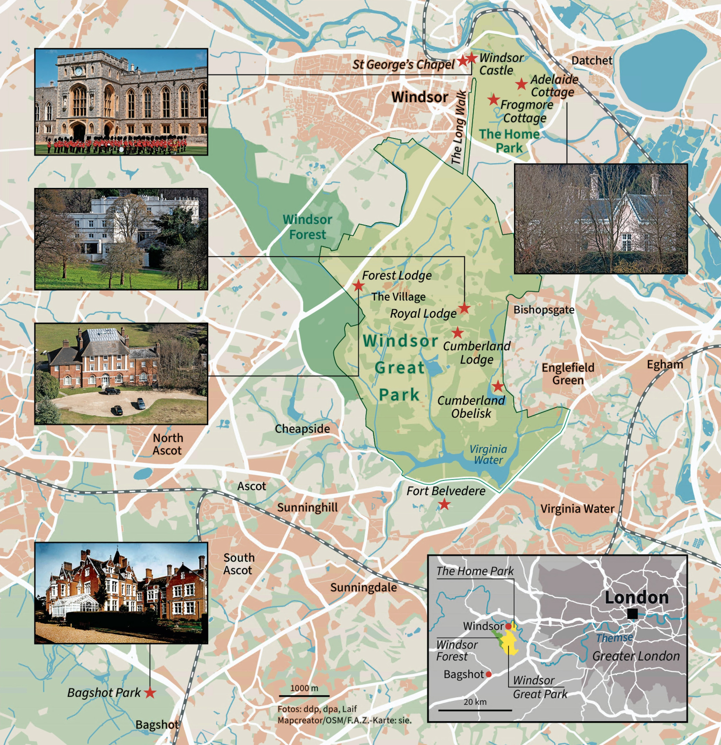 Der Grundbesitz um Schloss Windsor umfasst neben dem „Großen Park“ auch die Flächen zweier Bauernhöfe, allerlei Schaugärten und den „Home Park“, einen eigens gesicherten Schlossgarten direkt am Wohnsitz des Königs. Das Areal ist mehr als 60 Quadratkilometer groß, sowohl der Englische Garten in München als auch der Central Park in Manhattan hätten also fast 20-mal darin Platz. Die Burg, die den Kern des Schlosses bildet, wurde von Wilhelm dem Eroberer auf einem Kalksteinfels über der Themse errichtet. Seit mehr als 900 Jahren dient sie als Wohnsitz englischer Könige, wobei die gegenwärtige neogotische Gestalt der Anlage wesentlich aus dem 19. Jahrhundert stammt.