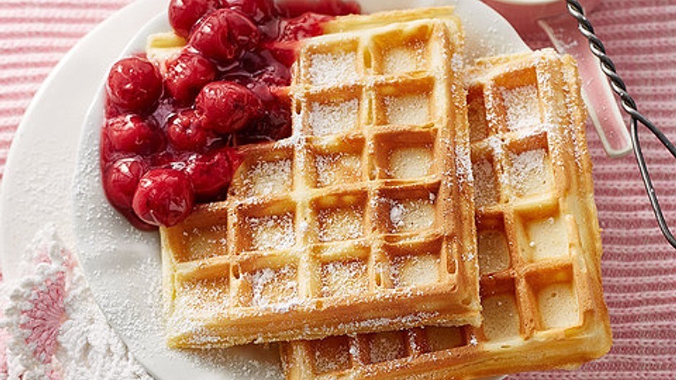 Das Waffeleisen aufheizen, einfetten, den Teig einfüllen und die Waffeln goldgelb backen. Mit Puderzucker oder Zimtzucker bestreut sofort servieren.