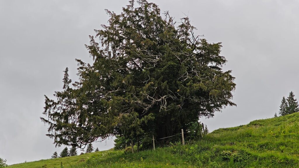 Doch der vermutlich älteste Baum Deutschlands steht fernab des Trubels: auf einer beweideten Alpwiese in 1100 Metern Höhe an der Nordseite der Hochgrat-Bergkette im Allgäu. So viele Meter sie hoch in den Bergen steht, so viele Jahre hat sie wohl auf dem Buckel.