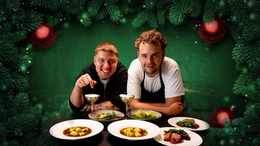 Marianus von Hörsten (r.) und Andy Zingler stehen vor Tellern mit Gerichten für ein Weihnachtsmenü | NDR, Claudia Timmann