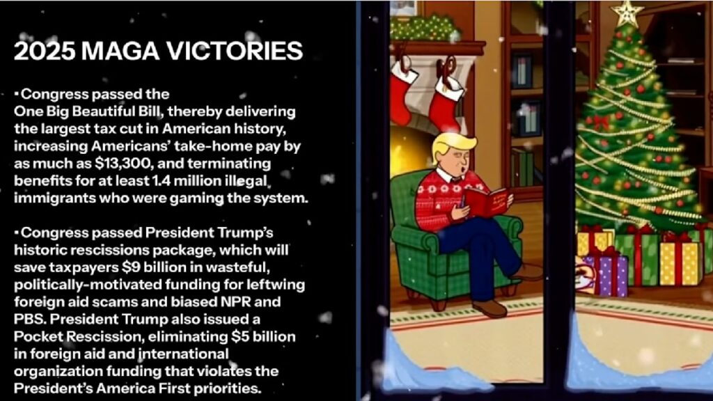 Mit rotem Pullover, akkurater Haartolle und einem Buch sitzt er in einem Sessel unter dem Weihnachtsbaum: US-Präsident Donald Trump als eine Zeichentrickfigur, die eine Geschichte vorliest. Nur dass es sich bei dieser Geschichte um die aus seiner Sicht erfolgreiche Bilanz der „Make America Great Again“-Bewegung handelt.