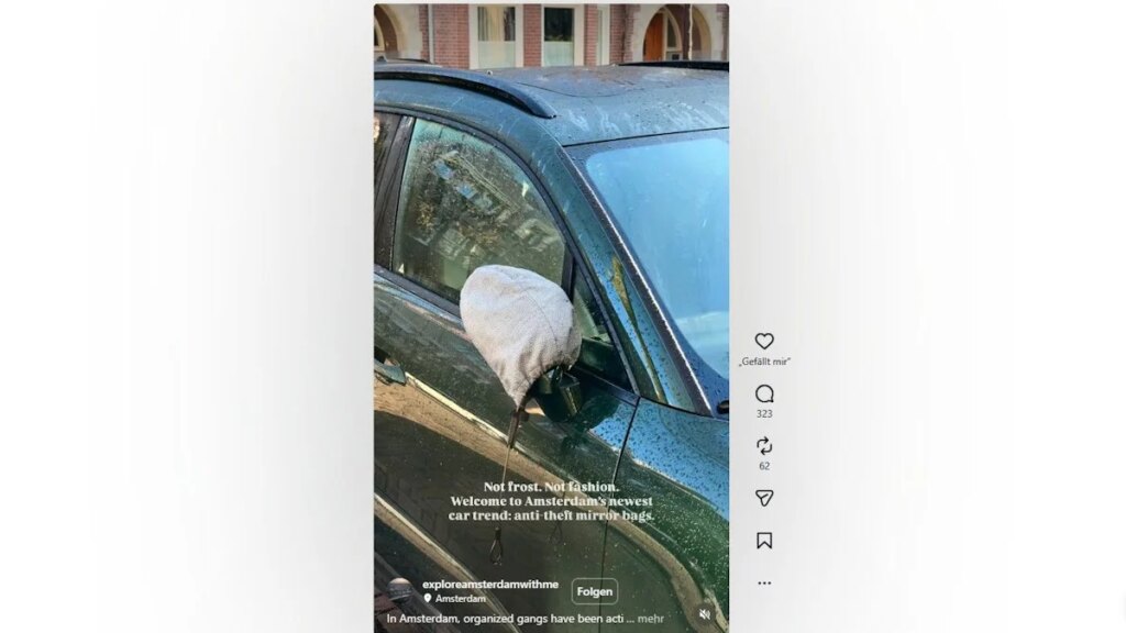 Doch die Autobesitzerinnen und -besitzer rüsten auf. Auf Amsterdams Straßen sind immer häufiger teure Fahrzeuge zu sehen, deren Außenspiegel mit Beuteln geschützt werden – und zwar nicht gegen Kälte oder aus modischen Gründen, sondern gegen Kriminelle. Auf Instagram gibt es bereits Bilder vom neuen Trend der Außenspiegelhauben an Ferraris, Porsches oder Audis.