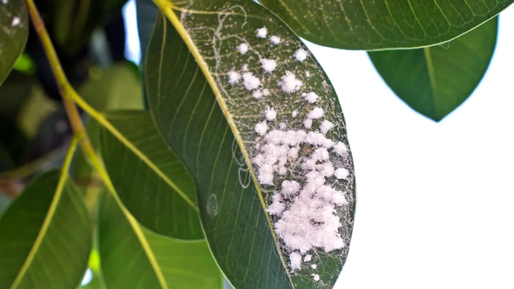 Ein von Wollläusen befallenes Blatt eines Gummibaumes