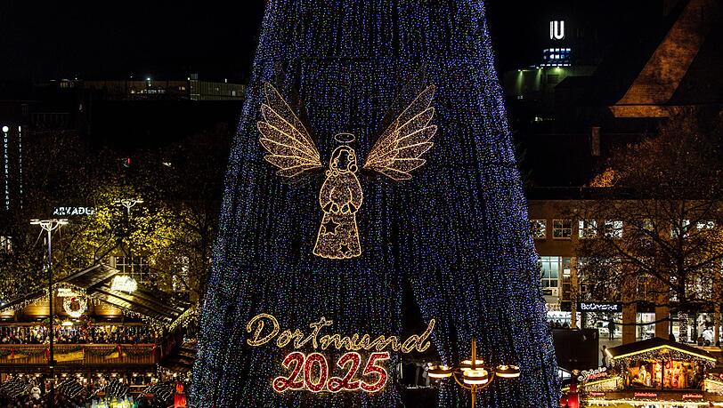 Er ist 45 Meter hoch, besteht aus rund 1.200 Rotfichten und ist laut der Stadtverwaltung der weltgrößte seiner Art: Der traditionelle Weihnachtsbaum in Dortmund ist feierlich zum Leuchten gebracht worden. Der Koloss aus Rotfichten aus dem Sauerland wird gekrönt von einem vier Meter hohen illuminierten Engel, der weit über die Weihnachtsstadt hinweg strahlt.