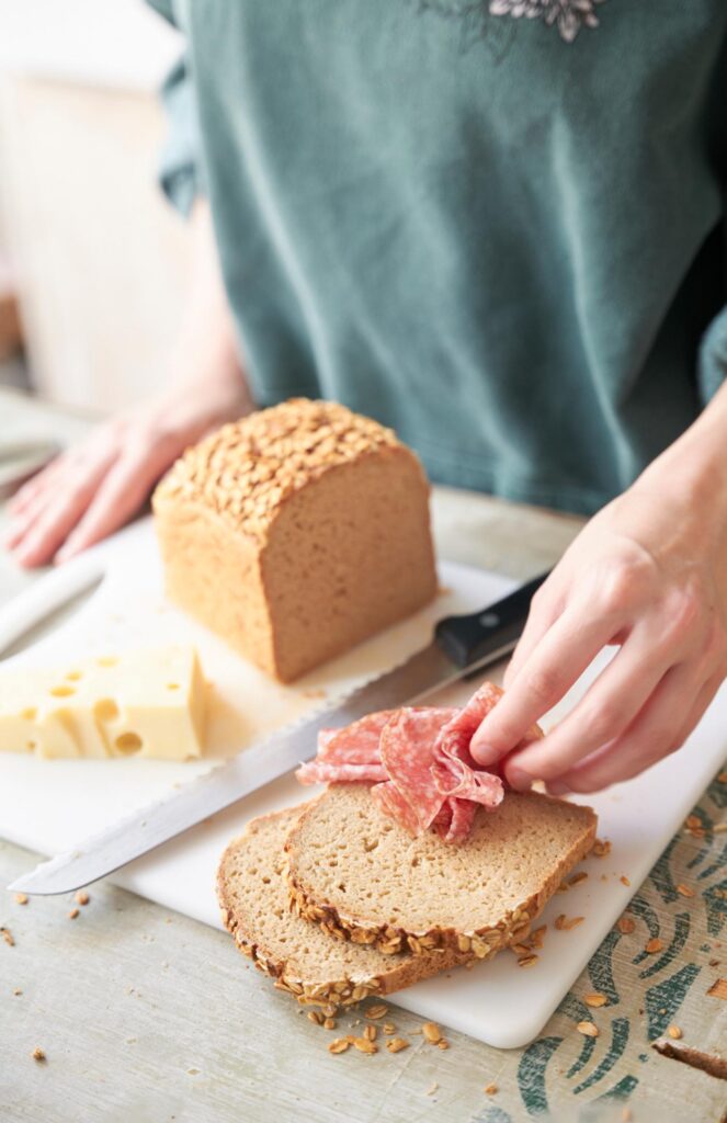 Und das ohne seltsam klingende Namen aus dem Chemiebaukasten. Probiere es aus! Einfach die Zutaten mit einem Löffel verrühren, in die Kastenform füllen, im Raum oder im Kühlschrank über Nacht aufgehen lassen. Dann direkt in den Ofen schieben und backen. Niemand wird merken, dass es ein glutenfreies Brot ist!