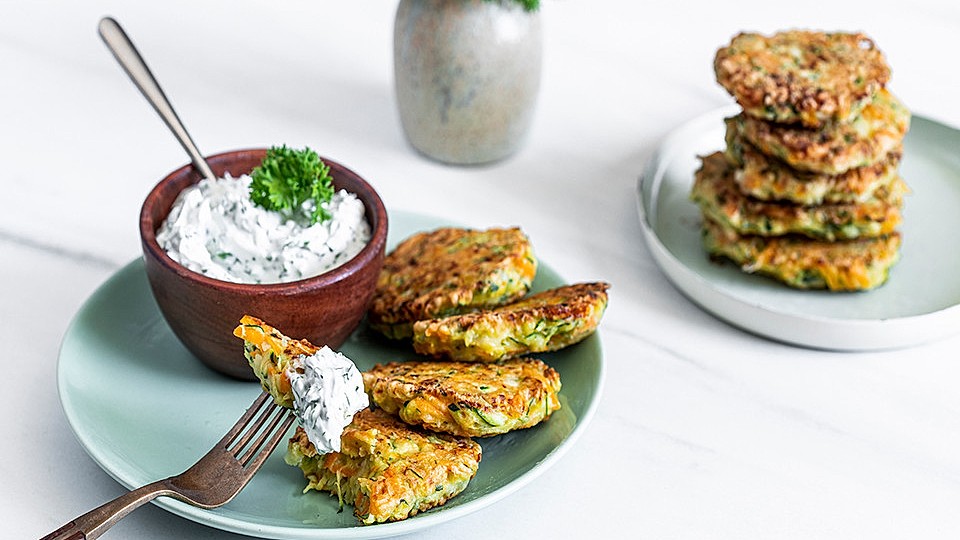 Zucchini-Möhren-Puffer mit Kräuter-Joghurt-Creme