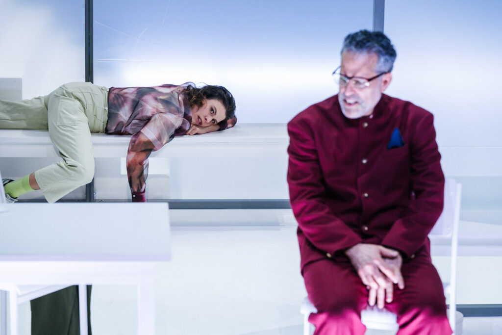 Unter der Regie von Leonie Rebentisch verströmt die Bühne in Hannover den weißkalten Charme des Reichtums, während das textile Design Richard (Max Landgrebe) als modebewussten Egozentriker auszeichnet. Das passt. Er ist ein reicher Pensionär, der aus Angst vor dem Weltgeschehen in eine schwer bewachte Gated Community gezogen ist. Dieses luxuriöse Gefängnis verkauft Isolation als Sicherheit und ermöglicht den Rückzug in eine winzige Wirklichkeitsblase, die wie ein Glaskasten designt ist.